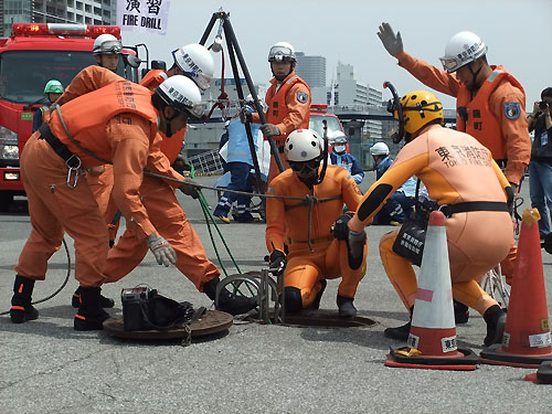 下水道工事中、ゲリラ豪雨で急激に増水して作業員が流されたとの想定の救助訓練が行われた。